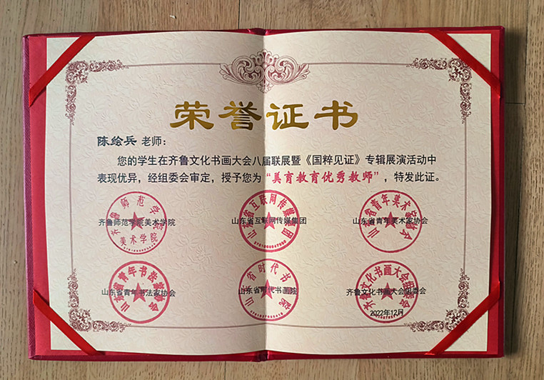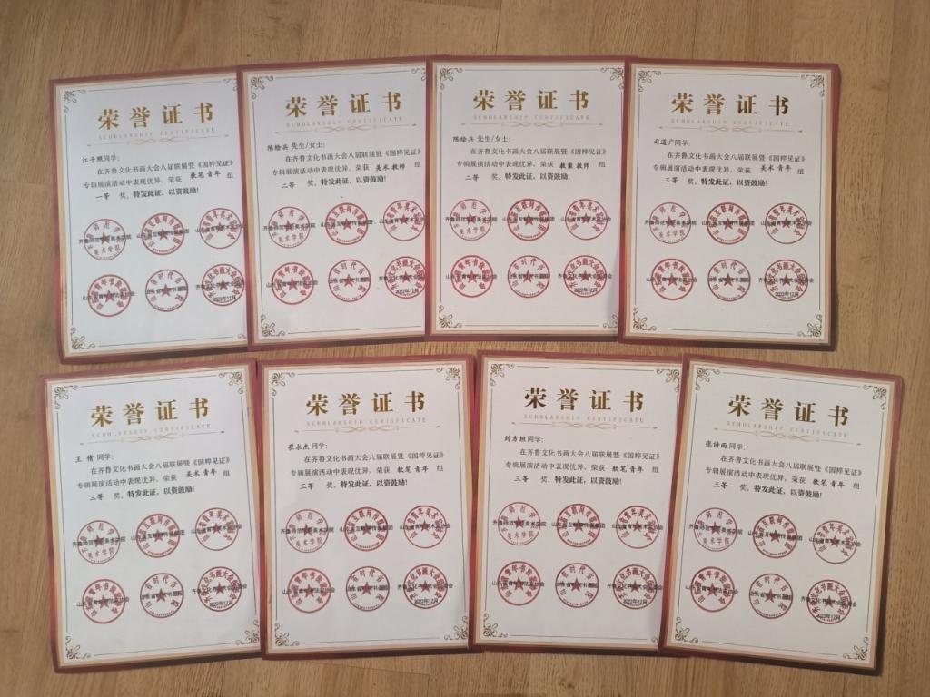 本次大会由山东省青年美术家协会、山东省青年书法家协会、齐鲁师范学院美术学院、山东省互联网传媒集团、山东省时代书画院、齐鲁文化书画大会组委会联合举办。组委会邀请专家、学者组成评审团,对入展作品按类别采取现场评选和视频直播相结合的方式进行评审。江子照同学获软笔青年组一等奖,张诗雨、崔永杰、刘方坦同学分获软笔青年组三等奖;司道广、王倩同学分获美术青年组三等奖;指导教师陈绘兵在美术教师组和教案教师组斩获两个二等奖。