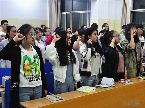 5月8日晚,文法系秘书学16-1班在2#303开展重温入团誓言活动,团支书王晗晴主持,该班全体成员参加。
