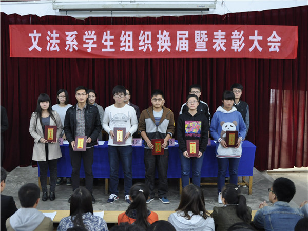 10月16日下午,文法系在八角楼举办学生组织换届暨表彰大会。团总支老师刘明远、郭艳培,各学生组织负责人、上一届优秀学生干部、干事和新一届学生组织全体成员参加了本次活动。