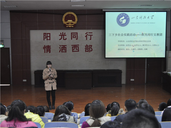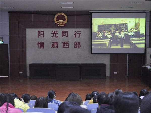 参加实地支教的同学首先对支教地的位置、经济和气候条件等进行了详细的介绍,使在坐的学生观众对西部山区现状有了更多的了解。随后,用ppt展示了支教流程及教课过程等,所有在场同学被西部艰苦环境下成长的孩子坚强的毅力、执着的信念、求知的眼神所感动,也被支教同学的无私奉献,默默付出深深的触动。支教期间的视频展示中,西部山区孩子们纯真的笑脸,家访时家长们质朴的感谢,支教同学满满的收获令人意犹未尽。