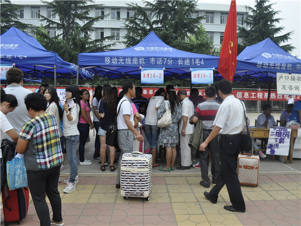 早上七点始,彩旗飘飘,初秋的校园显得格外美丽。清晨的霞光映照着美丽的校园,也映照着每一个同学忙碌的身影。看到新生的到来,学长学姐们热情涌上前帮助家长提行李,热情地把他们带到新生接待处。学生兼职辅导员温和而有礼貌,有条不紊地帮新生办好所有报到手续,发放报到注册流程,安全指南、致家长的一封信、宿舍钥匙……提醒新生报到时应该注意的相关事项。新同学在学长们的全程帮助下,顺利的入住学生宿舍,快速的熟悉了学校环境,学长们耐心的回答解决了他们对学习和生活中存在的问题,为他们尽快适应大学生活打下了坚实的基础。同时各学生组织同学的热情、主动、温馨的服务,让每一位新生及家长都能得到一丝温暖,他们的汗水和辛劳换来了一张张满意的笑脸,得到新生和家长的一致肯定。