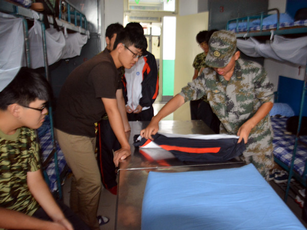 本次活动以宿舍为单位,先由新生自己进行内务整理,然后再由军训教官对每个宿舍的整理情况进行指导并做出示范。教官从床褥的整理、洗刷用品的摆放以及衣物的叠放等方面进行耐心的讲解,并且给同学们重点演示了“豆腐块”的叠法,从简单的叠压到被角的整理,每一个步骤都讲得细致入微。