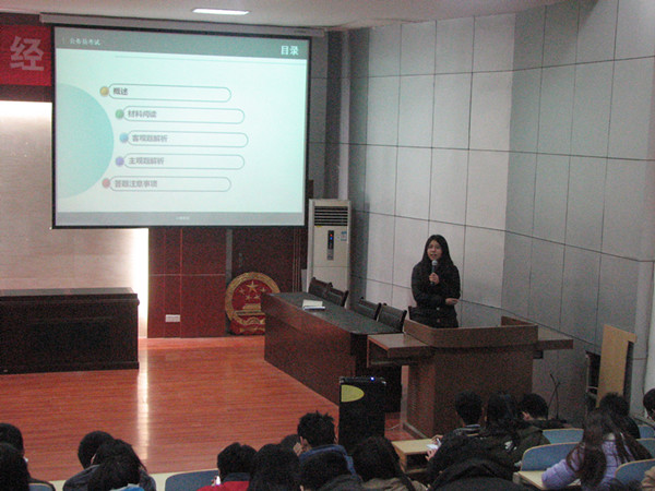 四位学员都是今年刚考录到地税系统的公务员,有的行测或总成绩都名列前茅。首先,郭潘龙重点讲解公务员的复习规划。他从岗位的选择、目标的定位和职位的要求等方面作了详细的介绍;周景华则针对行政能力测试部分的做题思路和技巧作了深入的说明,让在场的同学获益颇丰;接着,于静重点介绍了申论的答题注意事项,按照客观承认问题,辩证分析问题,积极解决问题的思路,做到符合逻辑、结构清晰、重点突出和文字精炼;最后,王春娇重点介绍了结构化面试的基本题型、对策和需要注意的问题,语言幽默富有感染力,把自己的面试技巧和优势展现的淋漓尽致。