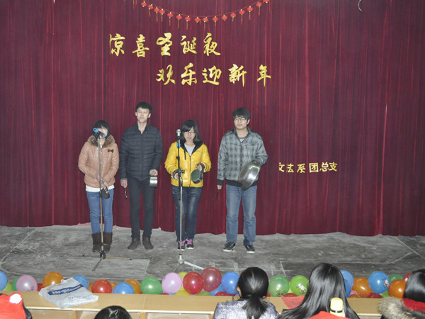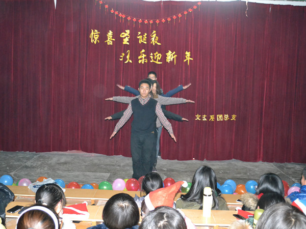伴随着圣诞美妙的音乐,我们又迎来了一个平安夜;怀着满心喜悦的心情,我们又将盼来一个新年。12月24日晚,文法系在八角楼举办了精彩纷呈的双旦晚会,简单的舞台布景尽显节俭,但欢乐祥和的氛围感染着在场的每一个人,给师生送上了一份“文化大餐”。