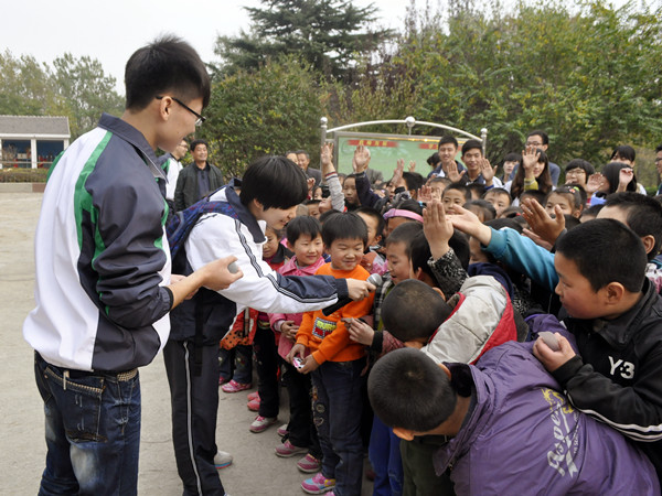 讲课结束后,大家齐聚在教学楼下,“哥哥姐姐”们为孩子唱歌跳舞,教他们简单的发音与舞蹈动作,为他们发奖品激发学习热情。大王小学由于条件有限,目前还没有音乐老师任课。从观看演出过程中他们所表现出来的兴奋劲就可以看出他们对音乐的渴望。文法系团总支书记郭涛林说,以后我们将不定期组织有音乐特长的志愿者来教孩子们唱歌。采访到为孩子唱歌的蒋欣与沈小贝时,她们说:“给孩子表演是一种全新的感觉,是一种感动,他们很单纯,很愿意为他们用心歌唱。”