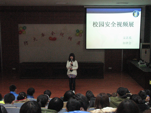 干枯冬季的到来让火灾危机的重要性凸现出来,为了更好地做好学生安全教育,让大家做到“早知道、早预防”,提高同学们的校园安全意识,学会基本的自救等知识,11月19日晚由文法系自律会办公室和餐检部主办的校园安全视频展活动在模拟法庭顺利举行。