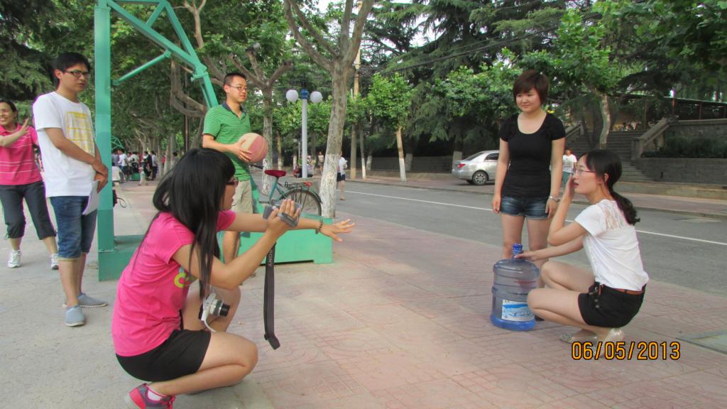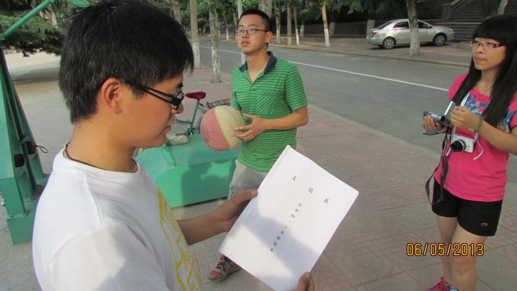 经过精心策划与充分准备,6月5日下午,法学09-1班的同学进行了第二幕剧情的拍摄活动。这组镜头的拍摄分别以团总支办公室和学校操场为场景展开,第一个故事表现了三名同学因未能早起而受到通报批评,在团总支老师冯艳艳的批评教育下承认错误、虚心改正;第二则故事表现了操场上两名女生互相帮助,体现了团结互助,和谐一家的良好风尚,也侧面反映了自觉进行体育锻炼的必要性。