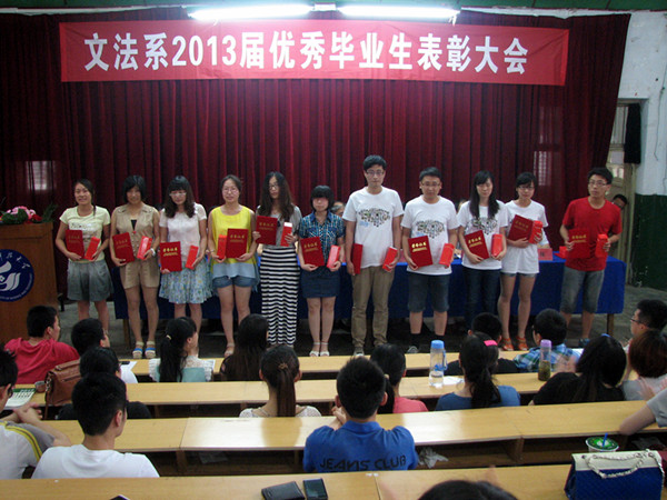 又是一年伤离别、情难舍的毕业季节,又是一年放飞梦想、展望未来的美好时节。为表彰2013届优秀毕业生取得的佳绩,充分展现他们良好的精神风貌,激励广大在校学生向先进学习,进一步端正态度,顽强拼搏,6月18日下午,文法系在八角楼召开了2013届优秀毕业生表彰大会,表彰会由团总支书记郭涛林主持。