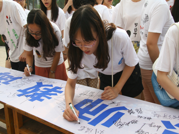 集体签名也是文法系毕业生安全文明离校系列活动之一,学会感恩,学会珍惜,文明离校也深深地感染在校学子,为校园文化建设与和谐校园建设贡献了力量。(作者:吕鸣悦 摄影:高铭辰)