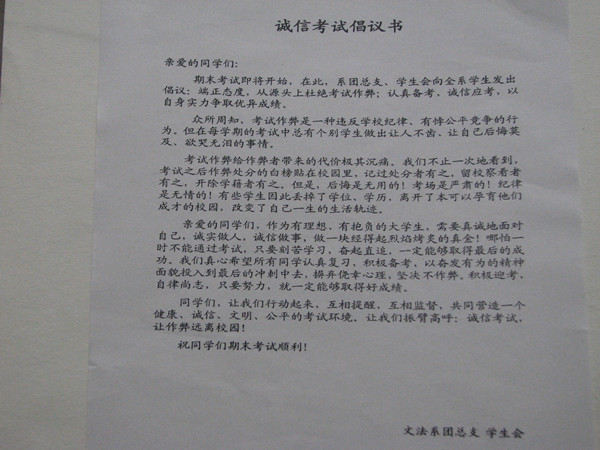 俗话说得好:人无信不立。诚信对一个人的成长成才乃至立业来说尤为重要。为了进一步加强学风建设,营造一个公平、公正的考试环境,用实际行动维护考试的公平,近日,文法系团总支和学生会通过召开诚信教育主题班会,发放《诚信考试倡议书》,签订《考试承诺书》和制作宣传展板等多种形式加强考风考纪教育。