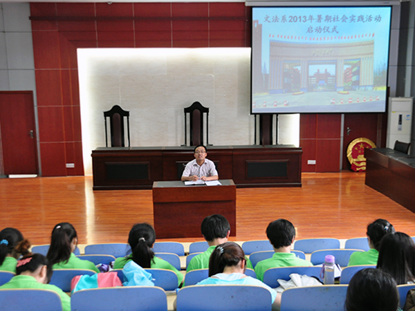 7月10日下午,文法系在模拟法庭举行了2013年暑期社会实践活动启动仪式,各团队指导教师、暑期“三下乡”重点团队成员、调研山东团队成员、泰安市党员远程教育志愿者、泰安市学生骨干社区挂职锻炼志愿者以及各团支部委员等70余人参加了启动仪式。