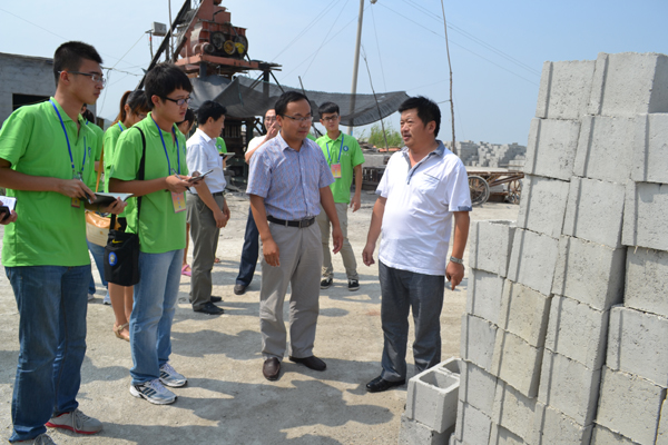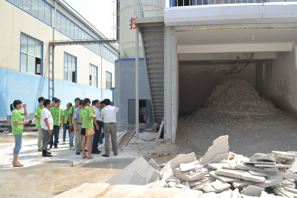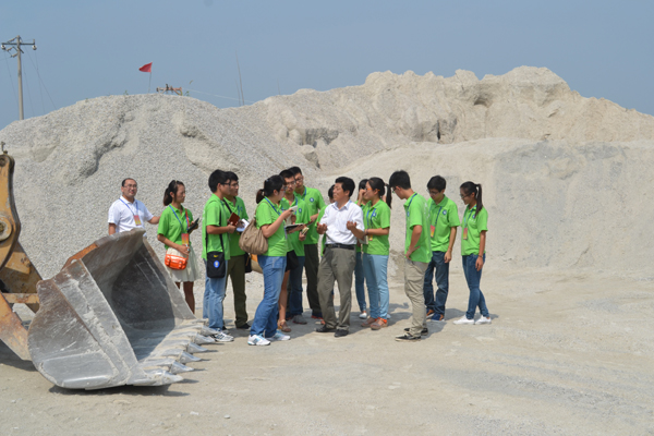 接着,实践团又来到郊外石材垃圾堆放现场,漫天的灰尘与烟雾,大小石子与泥沙堆占据了整片荒地。孙书记给实践团讲解到,鉴于石材垃圾数量杂、面积大,所以选择在野外解决大部分石材垃圾的初步处理。通过机器处理,利用锯底泥生产新石砖,取缔污染重成本高的烧砖,将新生成的轻体砖通过分类运输带送到不同机器方位,进行石板的切割与抛光,变废为宝,大大减少了石材垃圾对土地的污染。