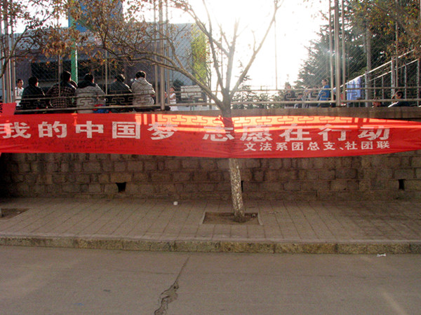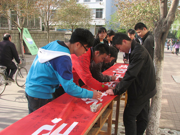 社团联的同学将写有“我的中国梦 志愿在行动”的横幅铺展开来,同学们踊跃参加,纷纷在横幅上签名,表达自己对志愿活动的支持。