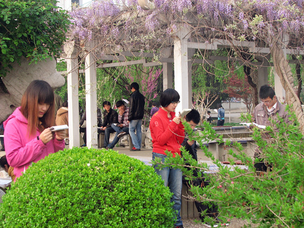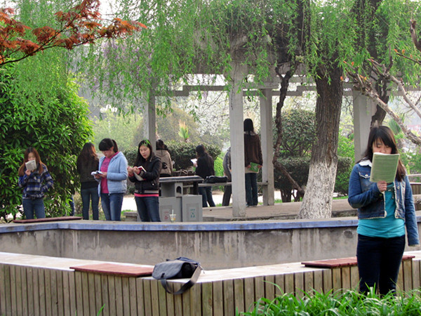 持续的低温天气丝毫没有影响同学们学习的热情,早7点不到,鹰湖边就早早传来同学们的朗朗读书声。一人手中一读物,朗朗的读书声声声悦耳。英语重在“听、说、读、写”,面对即将到来的英语四、六级考试,在清晨读书中的每位同学都有着自己的学习方法。有的同学手执单词本,大声背诵;有的同学坐在花园边不停地默写默背;有的同学则互相合作,模拟英语交流,练习口语语感。