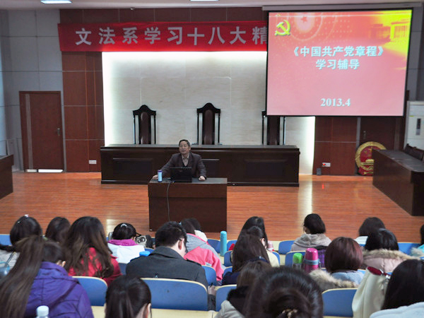 为深入学习宣传贯彻党的十八大精神,帮助学生进一步学习好、领会好会议精神,切实将师生思想和行动统一到党的十八大精神上来,把智慧和力量凝聚到各项任务上来, 4月1日下午文法系模拟法庭举行了学习十八大精神辅导报告会,全体学生党员、入党积极分子和部分团员参加了报告会。