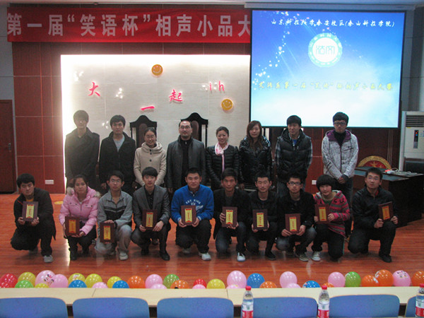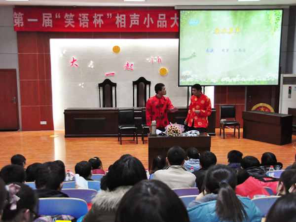 11月14日下午由文法系学生会权益部、生活部、女工部联合举办的第一届“笑语杯”相声小品大赛在模拟法庭成功举行,文法系辅导员老师刘明远、冯艳艳和郭艳培以及文法系学生会主席杨建超,信息系学生会主席姜月良和经管系学生会副主席刘星辰担任评委。