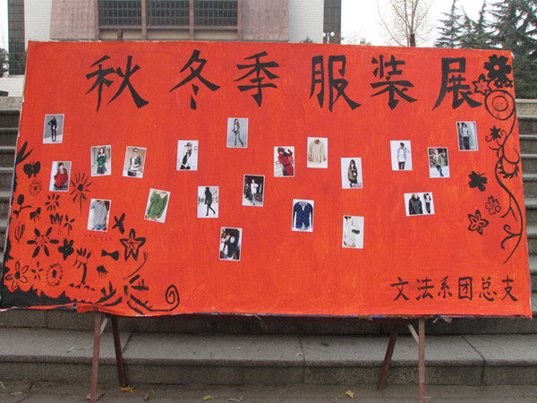 一张张美丽时髦、特色不同的时装让同学们感受到秋冬厚衣服也可以穿的漂亮、大方、得体,同时也让同学们间接学会多种色彩间衣服的搭配模式。时装多以大学生为模板,展现了当代大学生靓丽的青春风采。