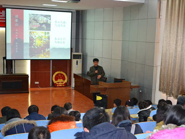 在短短的两个小时的时间里,周郢用丰富而富有诗意的语言向在座的同学介绍了泰山,使同学们对泰山文化有了更深的了解,对泰山精神也有了更深的领悟。(作者:董芳 摄影:孟鑫 王娟)