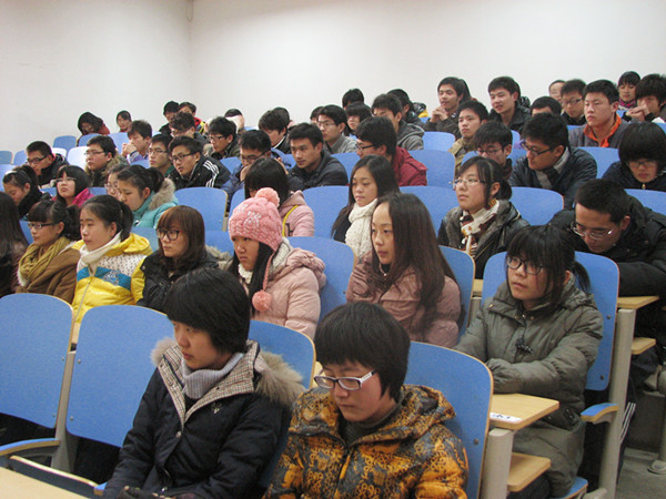 王主任首先从最近普遍关注的上课玩手机现象讲起,轻松亲切的开场很快吸引了同学们的注意。 在英语学习方面她谈到,同学们要在听、说、写英语的基础上找到适合自己的学习方法,老师们也会积极洞察学生英语学习的问题,多与英语任课教师交流,努力提高学生英语学习成绩,这对于大家今后考研至关重要。其次,王主任通过列举大量事例,幽默地引导同学们寒暑假一定要好好利用。对于大学生普遍感到困惑的恋爱问题,王主任从长辈的角度加以引导。在长达2个小时的时间里,同学们一直聚精会神,互动性很好。