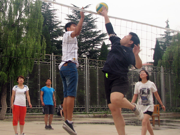 夏雨刚息,排球场干净清凉,很适合运动。此次比赛由教师队对抗学生队,大家各就各位,比赛开始了。这学期,经过师生排球赛的锻炼,大家都积累了丰富的“战斗”经验,两支队伍都剑拔弩张,队友间配合默契,双方实力不相上下。学生队年轻气盛,动作敏健,气势逼人;教师队则沉着稳重,以智取胜,步步为营。面对学生队的大力扣杀和完美发球,教师队加强防守、以柔胜刚。终于,一番激烈的较量后,教师队大获全胜,让学生队心悦诚服。