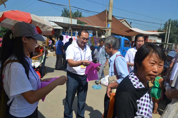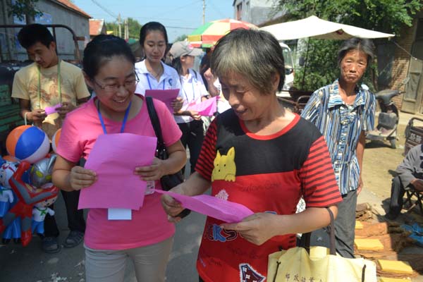 在农贸市场门口,三下乡实践团的队员们拉起了横幅,向过往群众们发放法律宣传材料,宣讲法律常识。为村民发放的宣传册主要围绕农村土地使用权、外出务工人员的土地所有权以及留守妇女儿童的权益保护等问题。在前来咨询的村民中,一位年近七旬的老人引起了同学们的注意,记者了解到,老人的子女全都在外打工,只有她一个人照顾孙女的起居生活,暑假过完孙女即将高中入学,老人听说当地允许办理助学贷款,但不知道具体的手续办理流程,故向同学们进行询问。最终通过同学们的耐心解答和指导,老人得到了满意的答复。
