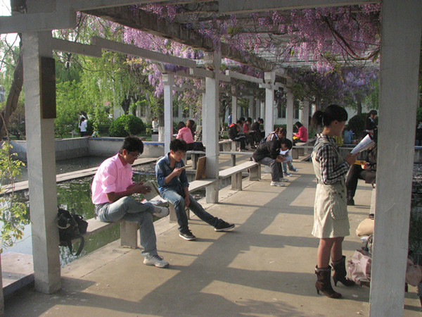 4月24日清晨,校园东侧的花园广场上,汇聚了一大批文法学生晨读学习的身影,花架下、喷泉边比比皆是,同学们有的高声诵读着英语作文,有的小声默背着单词考点,大家7:10就准时到场,直到7:50才收拾东西准备离开。