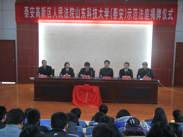 3月30日下午,“泰安高新区人民法院示范法庭”揭牌仪式在泰安校区文法系模拟法庭隆重举行。泰安高新区人民法院院长秦勇、办公室主任刘春霞、立案庭庭长宋礼翔、校区(学院)管理会副主任(副院长)王以功、文法系党总支马福泉、主任张学银以及160余名师生参加了揭牌仪式。