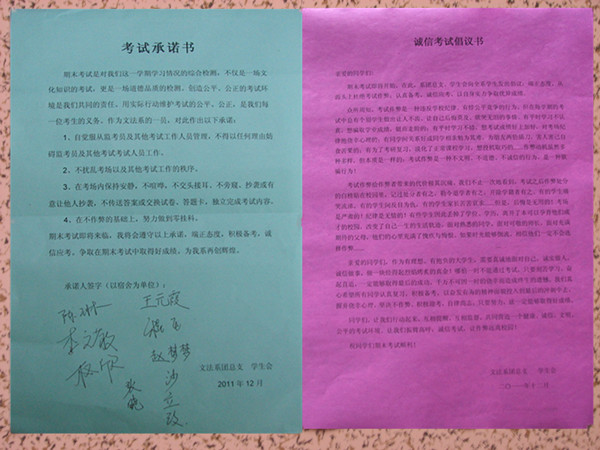 14日晚,一张张倡议书、承诺书在班级、宿舍中传递着,同学们通过实际行动表现了自己诚信考试的态度以及迎接考试的信心。这份诚信考试倡议书为同学们说明了违反考场纪律的严重后果,以及向发出了同学们诚信做人、诚信考试的强烈呼吁。历年来文法系较低的考试作弊率也得到了各级领导的一致认可。与此同时,为了促使同学们共同进步,我系以班级为单位开展了一系列学习帮扶活动,最大化的有效实现了党员、学生干部的“传帮带”作用,其效果更是在国家司法考试、研究生考试以及公务员考试中得到了显著体现。文法系学子面对此次期末考试作出了庄严承诺和诚信保证,他们表示会在今年的考试中继续发扬优良,用实际成绩证明自己的学习成果。(作者:吕博涵 摄影:孟鑫)