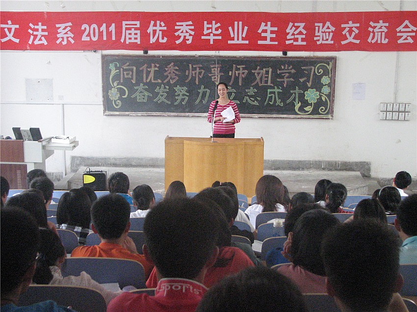 为了进一步激发学生学习热情和成才动力,发挥先进典型的示范带动作用,让低年级同学学习借鉴毕业生的成功经验,5月17日下午,文法系在1A107召开了2011届优秀毕业生经验交流会。