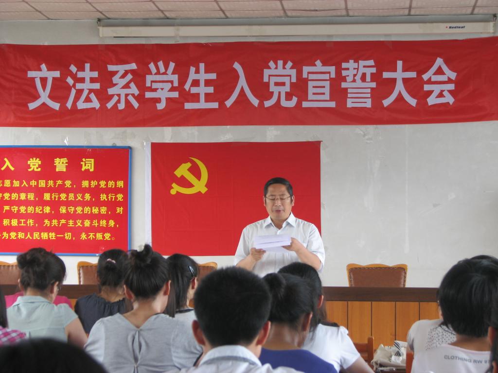 6月20日下午文法系在办公楼301举行新党员入党宣誓和老党员重温入党誓词仪式,文法系党总支书记马福泉、团总支老师桂自品和全体学生党员以及部分入党积极分子参加,仪式由学生党支部书记郭涛林主持。