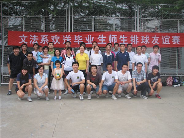 6月22日下午,由文法系党政办公室和团总支共同组织的欢送毕业生师生排球友谊赛在西校园排球场举行。比赛双方分别来自由文法系副主任王学宁、曲兆良等组成的教工代表队与和由团总支书记郭涛林带领的毕业生代表队。比赛在一片叫好声中和不断的掌声中火热进行,老师和毕业生们都展现出不俗的实力,毕业生们轮番上阵,老师们变换战术,最终老师们的实力更胜一筹以总比分2:1取得了比赛胜利。
