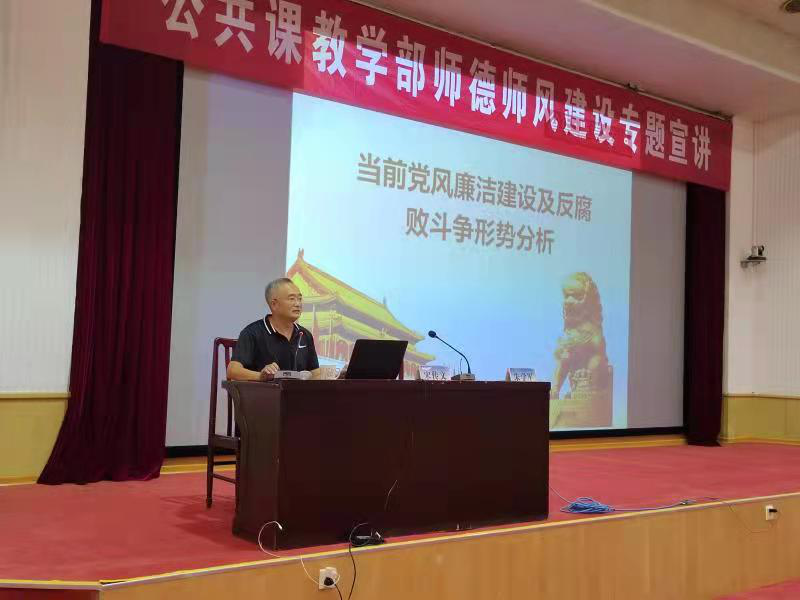 会上,宋传文围绕国际国内反腐败形势、近年来中纪委的主要工作任务、落实全面从严治党主体责任、完善监督体系等方面,对加强党风廉政建设进行了详细解读。对学校纪委(监察专员办公室)的基本情况和工作流程进行了介绍。随后,宋传文以“有所而为,有所不为”为题,重点对《新时代高校教师职业行为十项准则》、教育部“六项禁令”及《山东科技大学师德失范行为通报警示办法》等政策进行解读,并结合“布衣院士”卢永根、“时代楷模”张桂梅等模范教师的先进事迹以及违反师德师风的反面典型案例,对如何加强师德师风建设进行了系统、深入阐述。宋传文在会上指出,一言一行即师德,广大教师要心有所畏、言有所戒、行有所止,做到知行合一、担当作为,争做“四有”好老师。