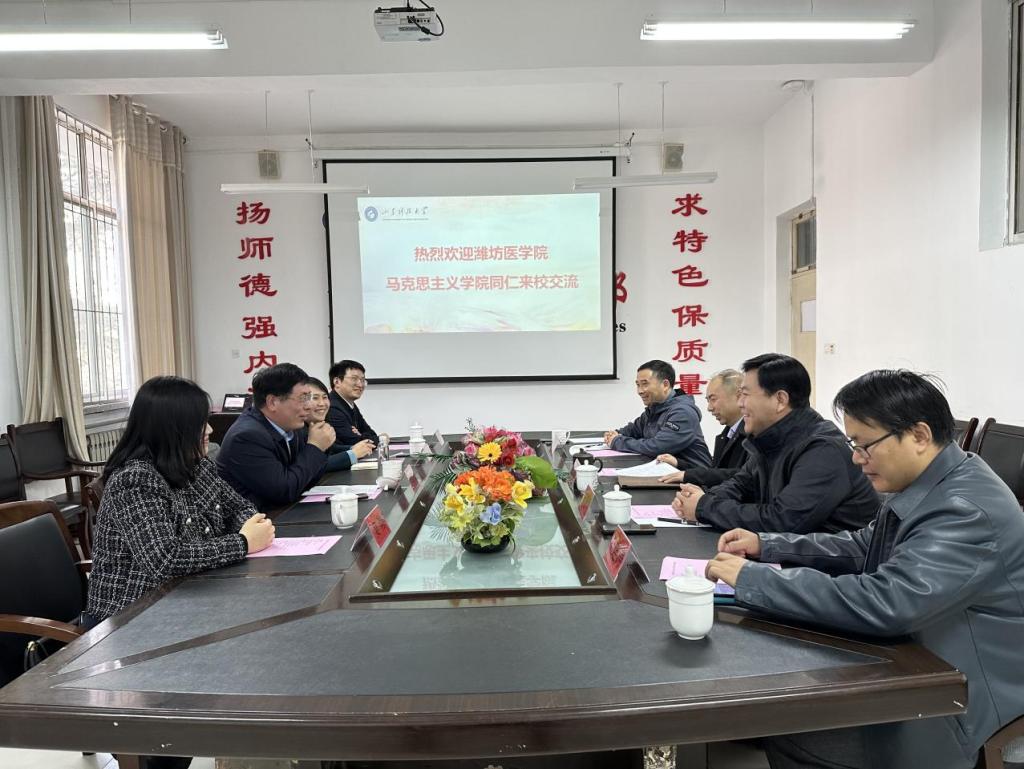 2月25日,潍坊医学院马克思主义学院院长李笃武、副院长朱宏晋一行四人来学部调研交流。学部主任朱学军、副主任亓慧坤、政法系主任桑爱友、副主任佀连涛等热情接待并参加座谈交流活动。