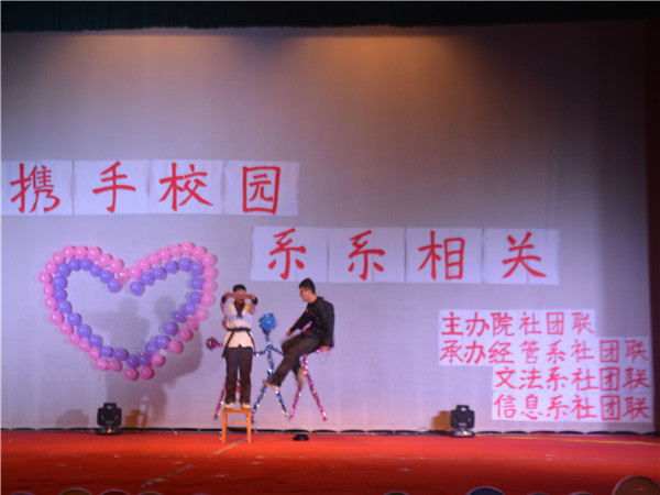 为加强西校园三系之间的联系,丰富同学们的课余文化生活,共同建设和谐文明的校园文化环境,12月12日晚,由院社团联主办,经管系社团联、文法系社团联和信息系社团联联合承办的双十二联谊晚会在礼堂成功举办。