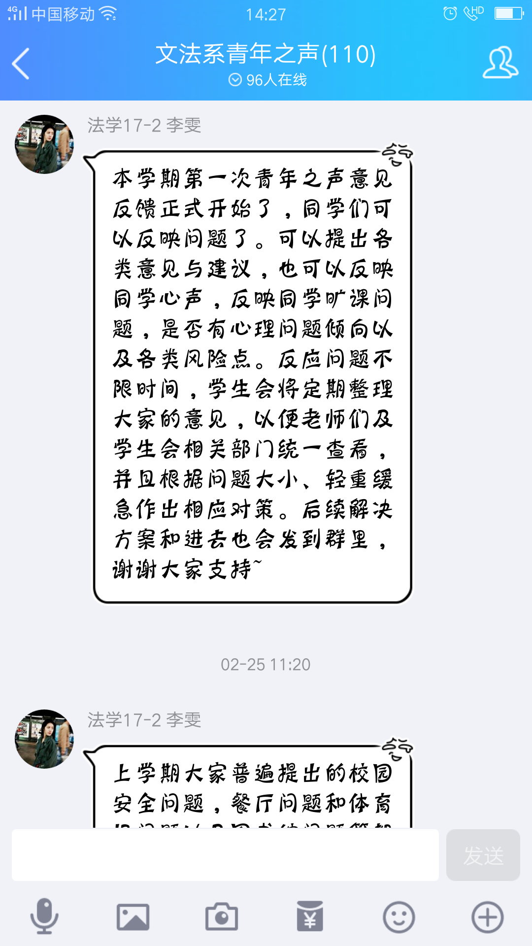 本学期开学第一天,法学17-1班代芯与行管16-1班丁雪晴在“青年之声”QQ 群内反映宿舍楼饮水机水流较小,且经常出现断电无水现象。文法系团总支书记郭涛林看到信息后,及时将学生处有关领导的答复耐心地向同学们进行了解释,得到了同学们的谅解和支持。“青年之声”QQ群负责人、学生会办公室副主任李雯还在群中对上学期工作做出总结:上学期大家普遍提出的校园存在的问题得到了领导高度重视并逐步解决,希望大家继续支持“青年之声”的工作,担负起自己的责任。