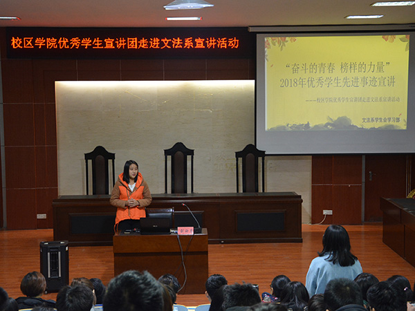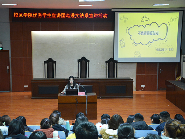 近日,文法系在模拟法庭举办校区学院优秀学生宣讲团走进文法系宣讲活动。本次活动邀请到精英挑战赛全国一等奖获得者信息管理与信息系统16-1班刘汝月和数学中国数学建模国际赛一等奖获得者信息工程15-1班李然担任主讲人。