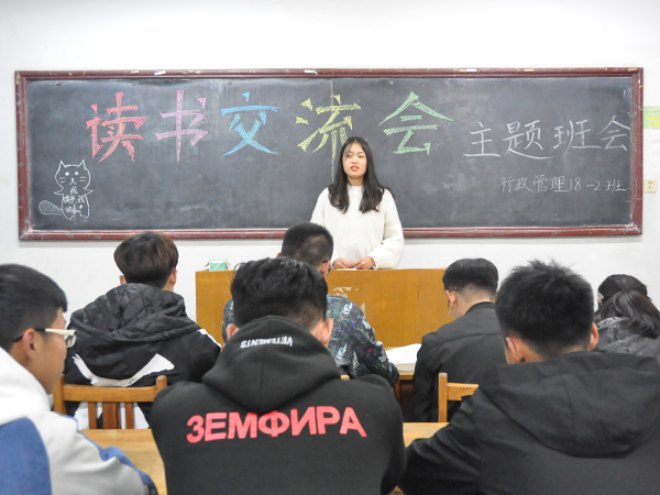 11月4日晚,文法系行政管理18-2班在5306举办“读书交流会”主题班会,班会由班长曹宪超主持,行政管理18-2班全体同学参加。