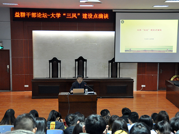 11月14日下午,文法系在模拟法庭举办“大学‘三风’建设点滴谈”专题讲座,学生会主要学生干部,大学生社团负责人,“益群”各组长以及各班级团支书、班长、学习委员参加,会议由文法系党总支副书记刘相明主讲。