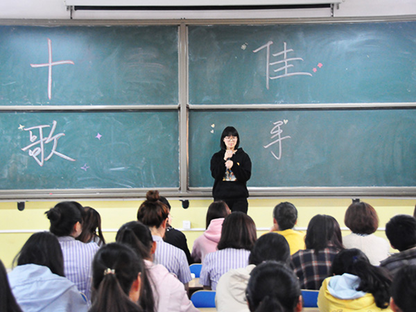 经过初赛的激烈角逐,共有14位选手顺利进入决赛。主持人致开幕词后,各位选手按赛前抽签顺序依次上台演唱歌曲。比赛在林冠良演唱的歌曲《在那不遥远的地方》中拉开帷幕,优美的旋律与动听的嗓音完美结合,告诉我们要勇敢追梦;尹梦雨一首英文歌曲《Because of you》演唱出女子掩藏在坚强外表下的忧愁和委屈;郭茹雪演唱的《如果没有你》带着淡淡的忧伤,仿佛在座听众都被带入进故事中…… 比赛过程中,选手们不仅能驾驭古风、民谣等多种类型的歌曲,而且音准、节奏也把握准确,赢得现场观众的阵阵掌声。文艺部部长杨淑婷演唱的歌曲《房间》、副部长张震带来舞蹈的《玩火》更将现场氛围推向高潮。最终,经过评委打分,郭茹雪获得一等奖,田珺等人获得二等奖、尹梦雨等人获得三等奖。