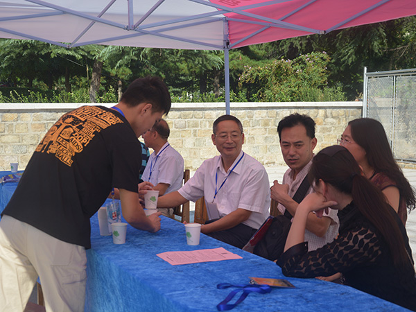 青年志愿者细心为正在与系领导交谈的新生家长倒水。一年复一年,只为将这份热情和真心传递。