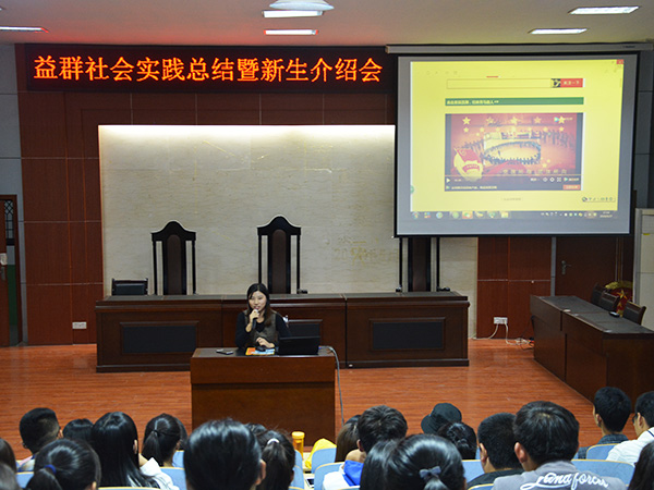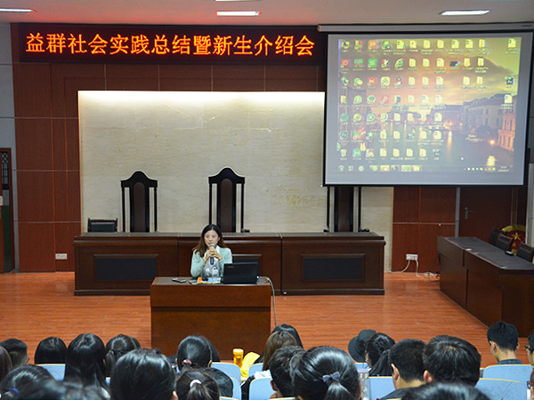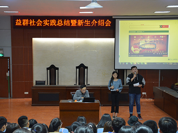 9月27日下午,文法系在模拟法庭举办益群暑期社会实践活动宣讲会,益群学生干部成长营负责人张雪、校区、学院青年马克思主义工程宣讲人李文琪、“益行人”答辩团队、益群各组负责人及2018级新生参加,杨涵和李承远主持交流会。