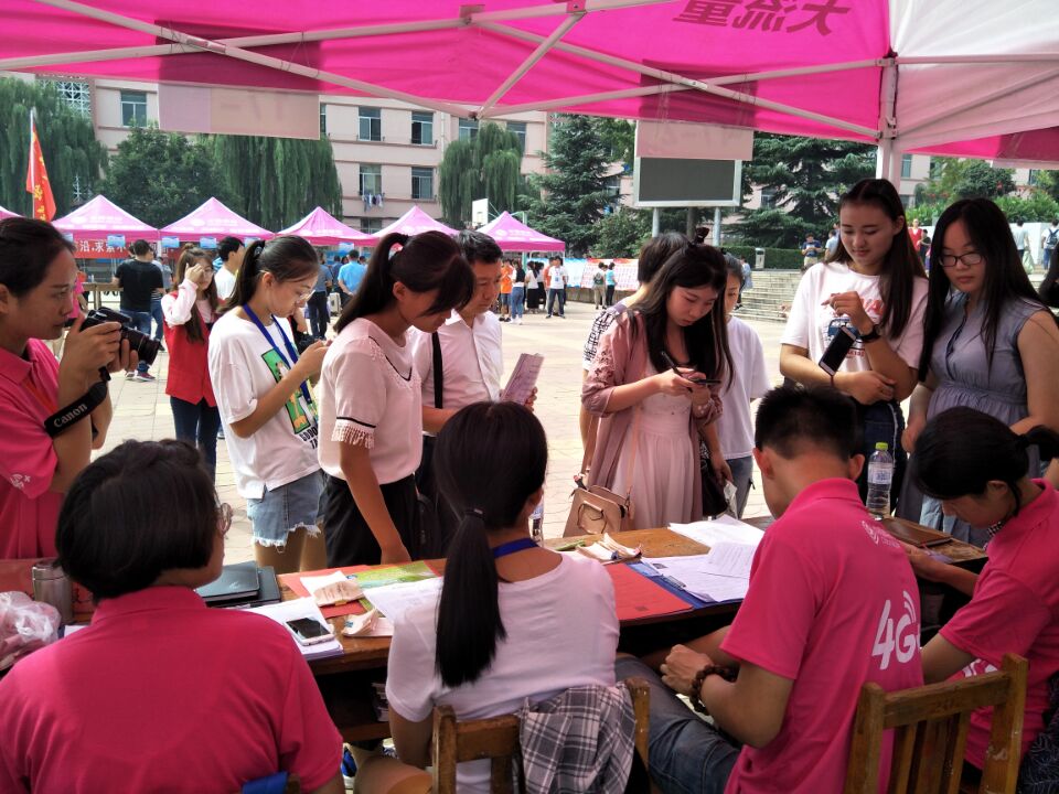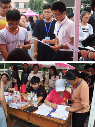 文法系17级共有7个班级,新生认牌报到,排队办理,井然有序。