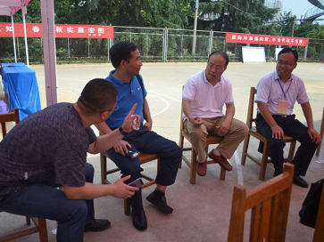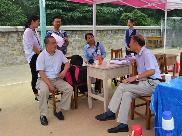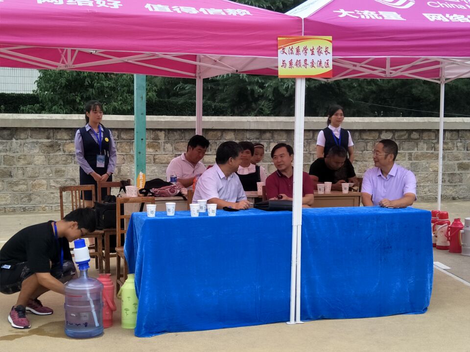 文法系党总支书记马福泉、副书记兼副主任刘相明与学生家长交流学校的教育和发展。