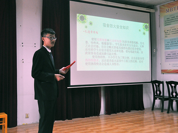本次活动分为PPT讲解、观看视频和问答环节。首先,主持人通过PPT的方式向同学们讲解宿舍防火安全知识和宿舍防盗应注意问题。他重点说明违章用电、宿舍抽烟及易燃物品的危害性,并请在座同学朗读安全知识守则,加强同学们对安全问题的重视。然后,主持人播放有关宿舍防火安全的视频。最后,主持人向在座同学提出10道关于防火防盗的问题,同学们都积极回答。