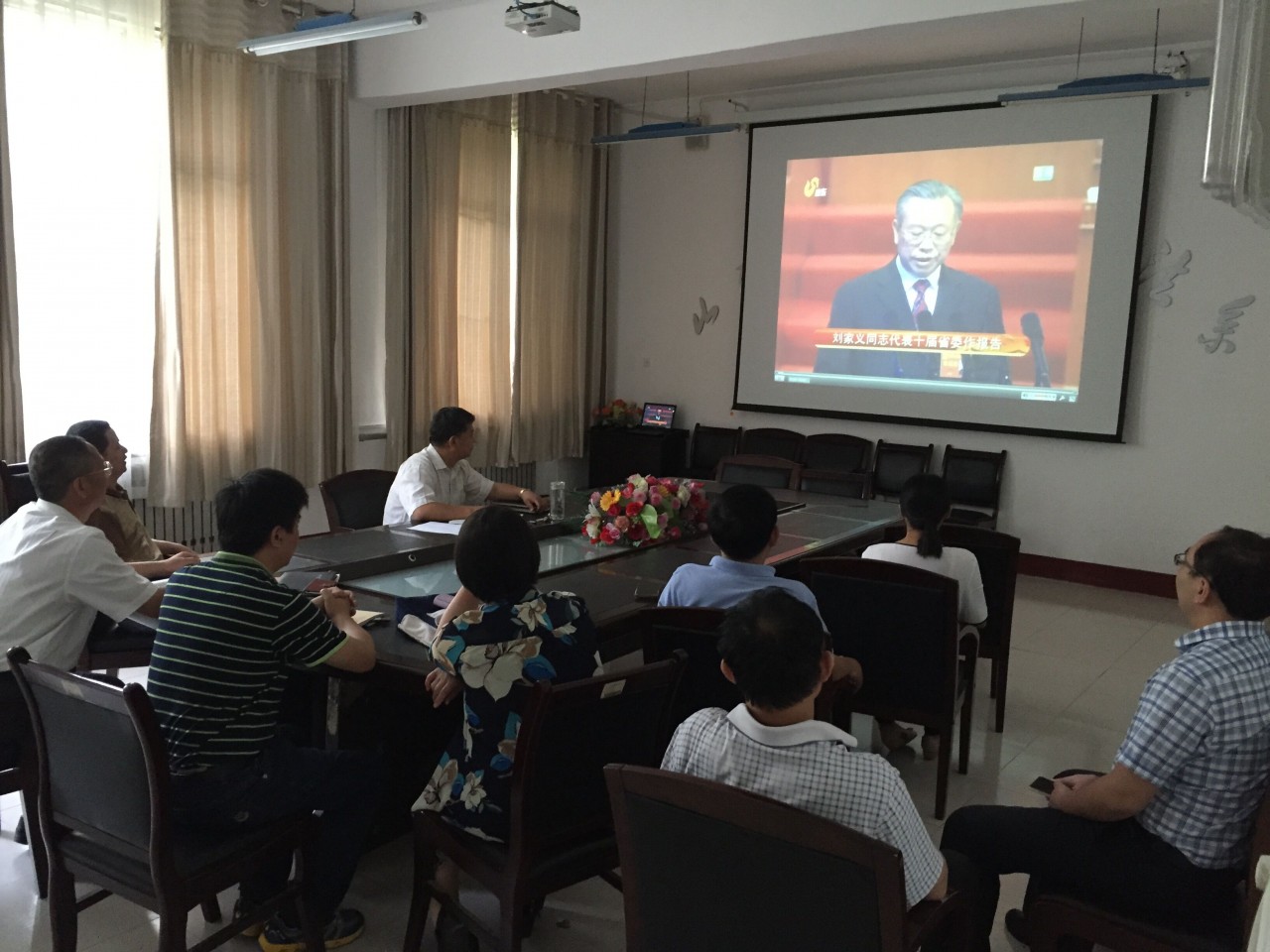 6月13日上午九时,文法系组织教职工党员在系会议室观看山东省第十一次党代表大会开幕式,系领导班子、团总支老师、部分教工党员参加。