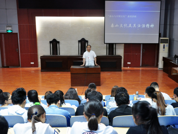 郭笃凌老师从“话说泰山”、“泰山文化的主要内容”、“泰山文化中的法治精神”三个方面为大家讲解。他从文学、史学与民间传说等三个角度介绍了泰山民间信仰的由来以及碧霞文化的演进过程;他从泰山的石刻文化、宗教文化、封禅文化、民俗文化等四个方面详细说明了泰山文化的博大精深;他结合自身调研经历,深入浅出地讲述泰山文化中的法治传统、法治实践;他结合泰安著名法治人物依法治县、为百姓谋福祉的事迹,详细阐述了泰山文化中的法治传统及其特点;他列举历朝历代泰安地区的法治实践,详细阐释了泰山文化中诸多法治实践在历代社会管理中发挥的作用;他还为在座同学推荐了泰山及其周边的主要法治景点。郭笃凌老师的精彩报告赢得了同学们热烈的掌声。