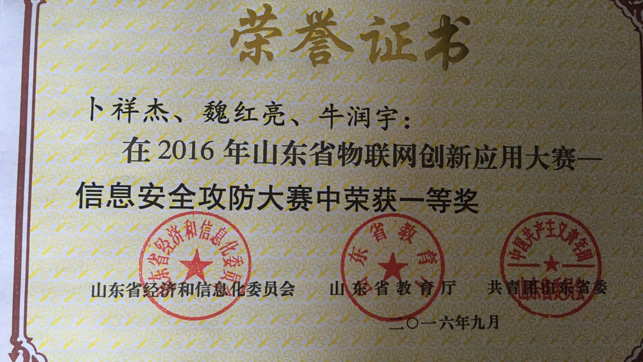 近几年,文法系学生积极跨系组队参赛。魏红亮同学入学以来一直对信息安全比较感兴趣,经常与信息系学生组队参加比赛。2014年,在第三届山东省大学生信息安全大赛中获团体第八名,个人三等奖;2015年,获山东省大学生信息安全知识竞赛团体一等奖;2015年,第四届山东省大学生信息安全大赛团体二等奖,个人三等奖;2016年,获第五届山东省“蓝盾杯”信息安全大赛一等奖。