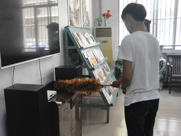 整理摆放好老人看过的书籍报纸,方便下次查看阅读。