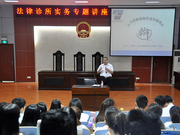 5月25日,文法系在模拟法庭举办法律诊所实务专题讲座,邀请山东同成律师事务所尹逊辉律师、于兆国律师作报告,系法学教研室江涛老师担任主持,15级法学专业全体学生参加。