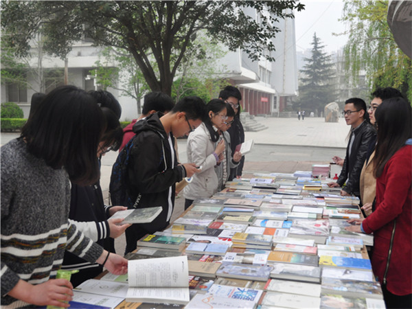 活动之前,读者俱乐部与文法系学生会成员亲自到新华书店挑选适合同学们阅读的书籍,一方面满足同学们的阅读兴趣,另一方面为提高同学们的阅读层次,增加畅销书籍的挑选量。活动期间,销售摊位设在人流量较大的3号楼附近,所有书籍以定价的9折销售,并有字帖、笔记本等赠品。书籍一经摆出就吸引了许多同学驻足观看翻阅,并相互讨论书中的内容,遇见志同道合的书友便侃侃而谈。